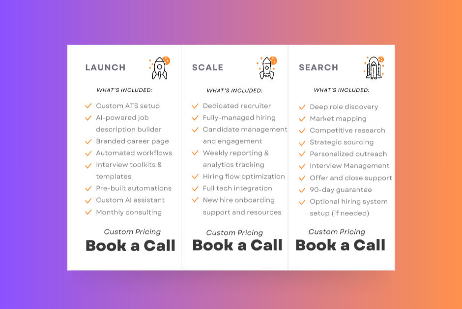| Scale | Full-stack hiring engine, dedicated recruiter, advanced analytics dashboards, custom AI automations and workflows | High-Growth Startups & Teams |